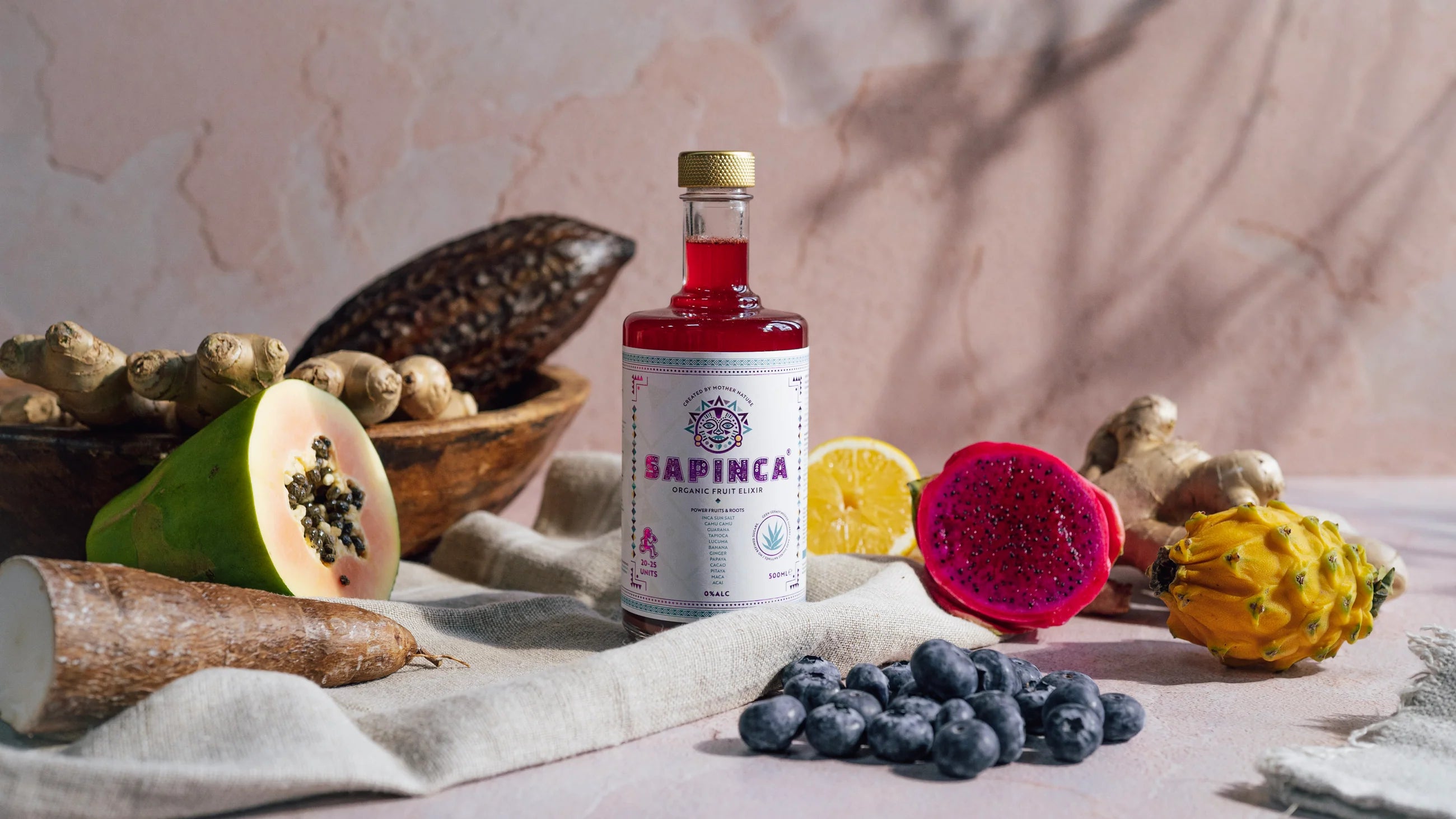 Lai izveidotu SAPINCA, mēs ceļojām pa pasauli, meklējot jaunas sastāvdaļas. Šī brauciena laikā šķērsojām Dienvidamerikas kalnus un iepazinām senās kultūras. Mēs atklājām īpašas saknes, par kurām iepriekš nebijām dzirdējuši, piemēram, Yacon, Galangal, Ashwagandha un Maca. Mēs atklājām arī unikālus augļus, piemēram, ēdamo melno mirti (camu camu), acai ogas, sarkano pitaju un guarānu.